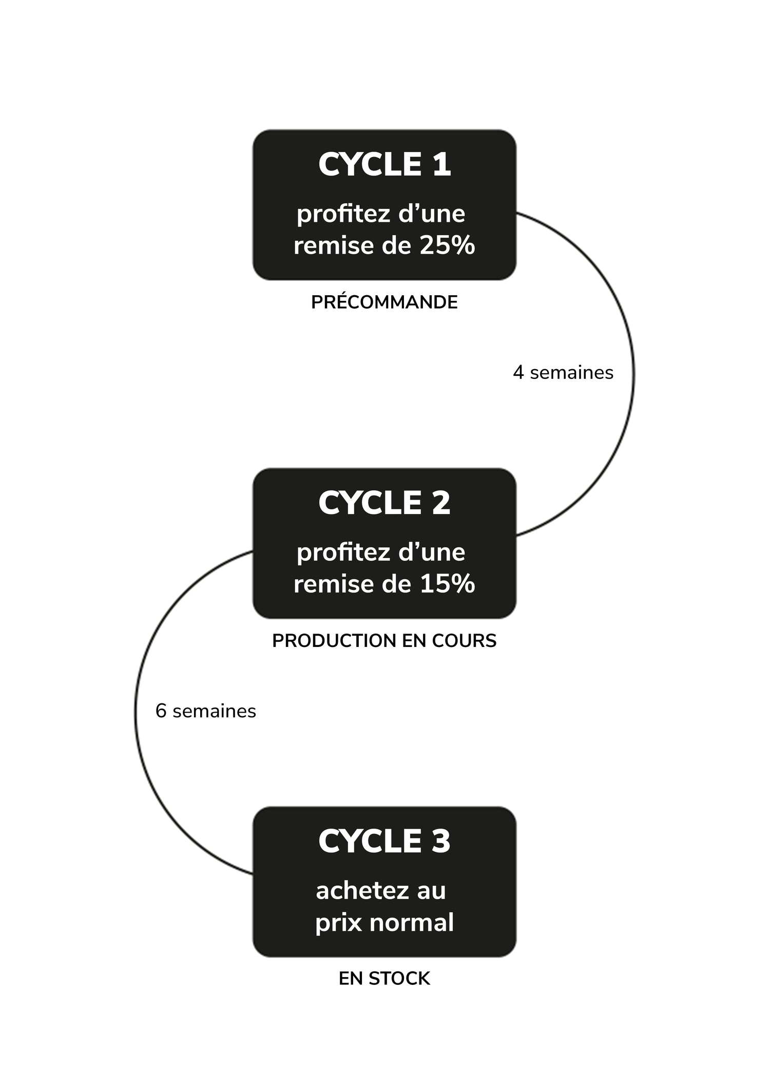 1 mois avant le commencement de la production, les créations de l'atelier sont disponibles en précommande avec 25% de remise.
